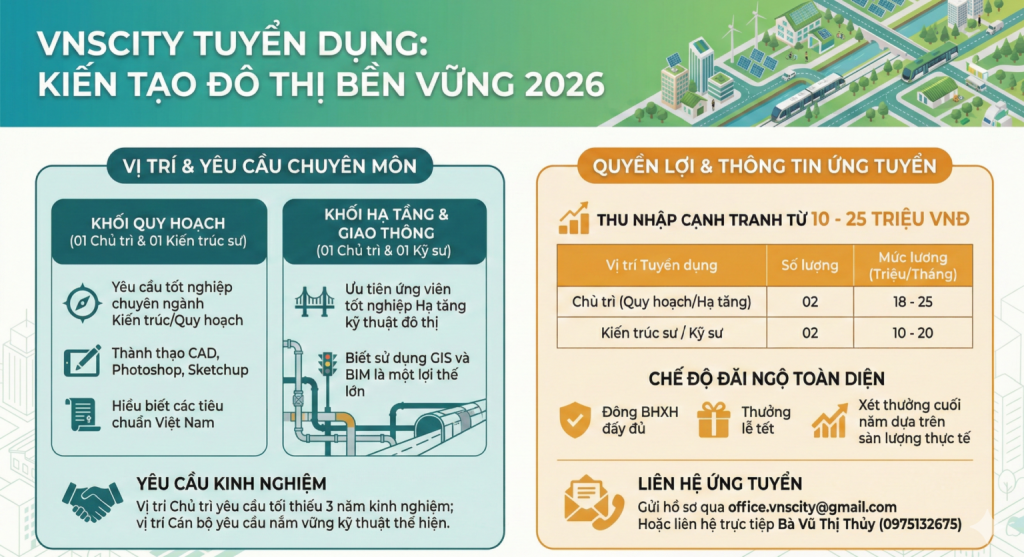 CÔNG TY CỔ PHẦN PHÁT TRIỂN ĐÔ THỊ BỀN VỮNG VIỆT NAM (VNSCITY) TUYỂN DỤNG KTS QUY HOẠCH VÀ KỸ SƯ HẠ TẦNG, KỸ SƯ GIAO THÔNG.